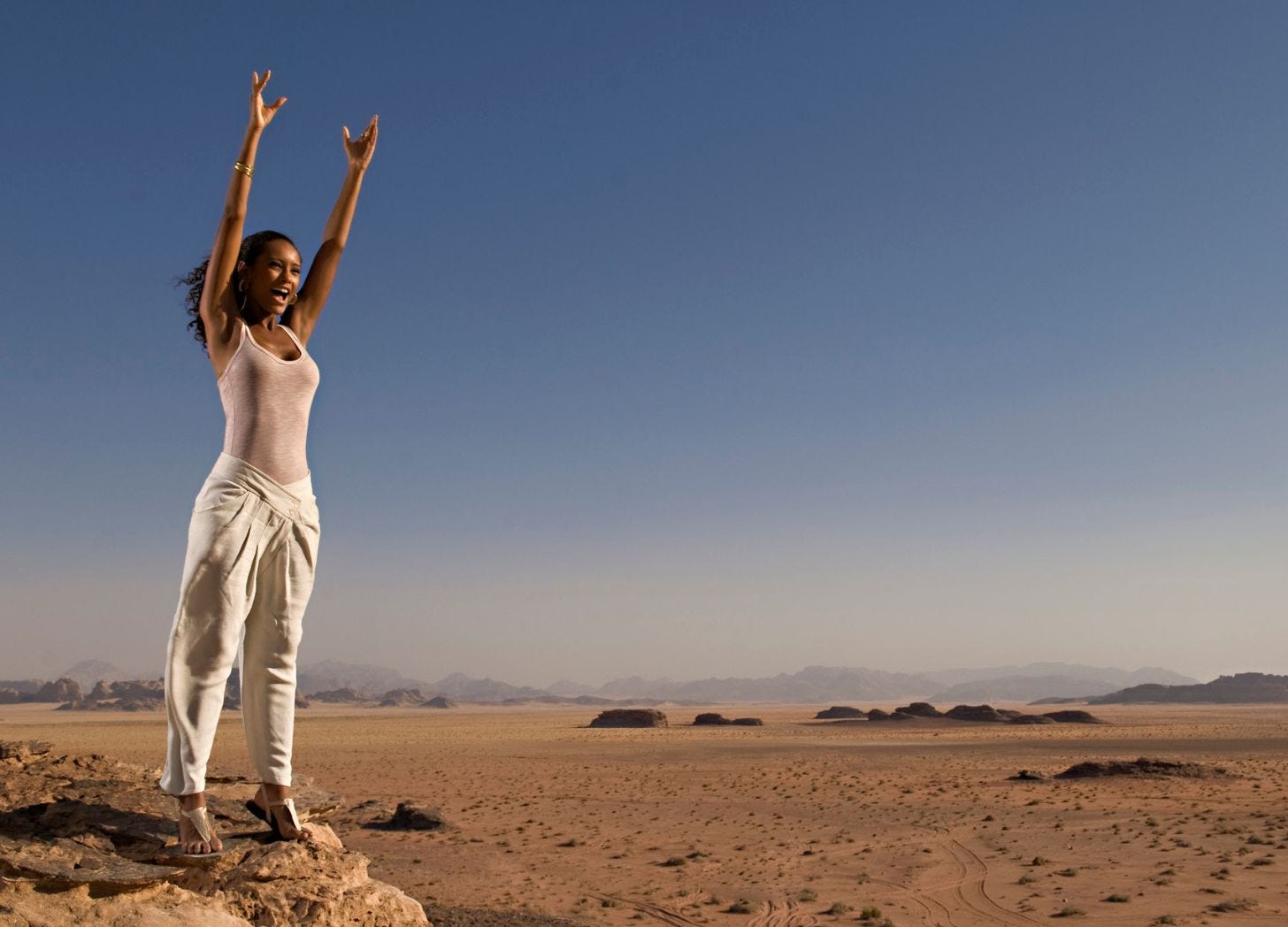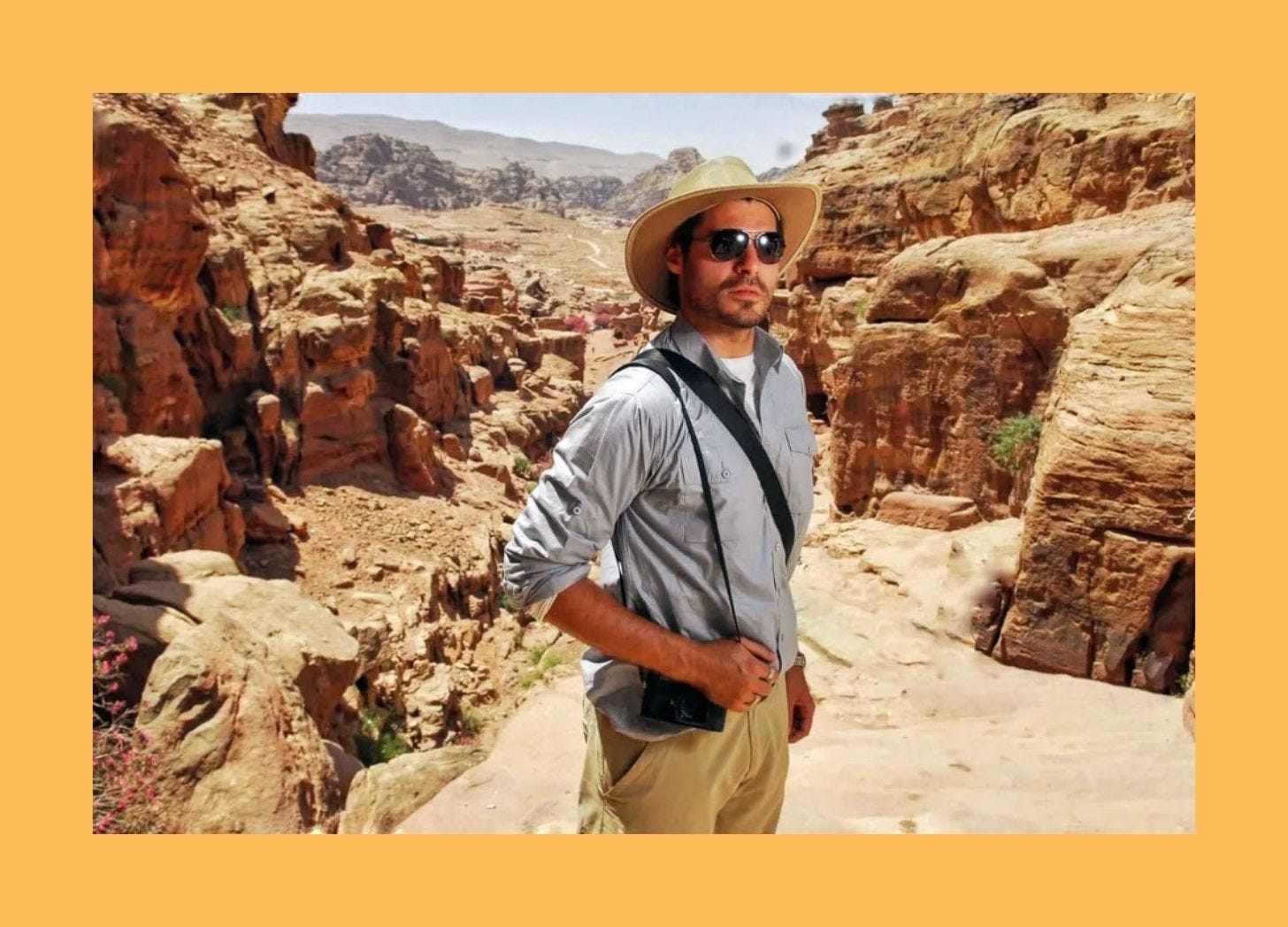 50 graus de um Sol de meio dia, deserto de Wadi Rum, Jordânia, Thiago Lacerda fotografado em f/10, 1/125s ISO 100 em uma sombrinha surrada, tem vídeo…