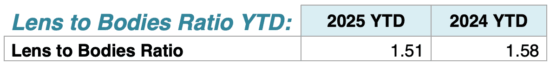 A razão de lentes vendidas por corpo caiu de 1,58 (2024) para 1,51 (2025).