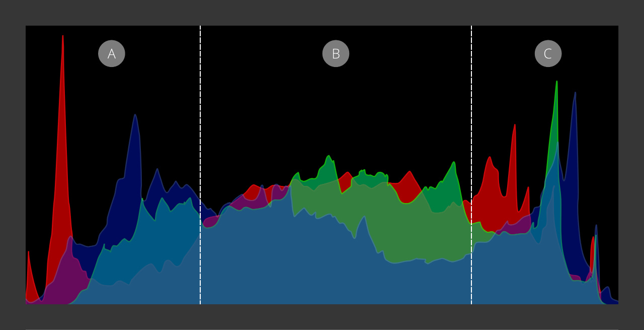 Aqui temos três histogramas sobrepostos - um para cada canal de cor primária (vermelho, verde e azul). Este tipo é especialmente útil para detectar dominantes de cor e ajustar o balanço de branco. Se você notar que o canal azul está deslocado para a direita enquanto os outros estão centralizados, sua imagem provavelmente tem uma dominante azul.