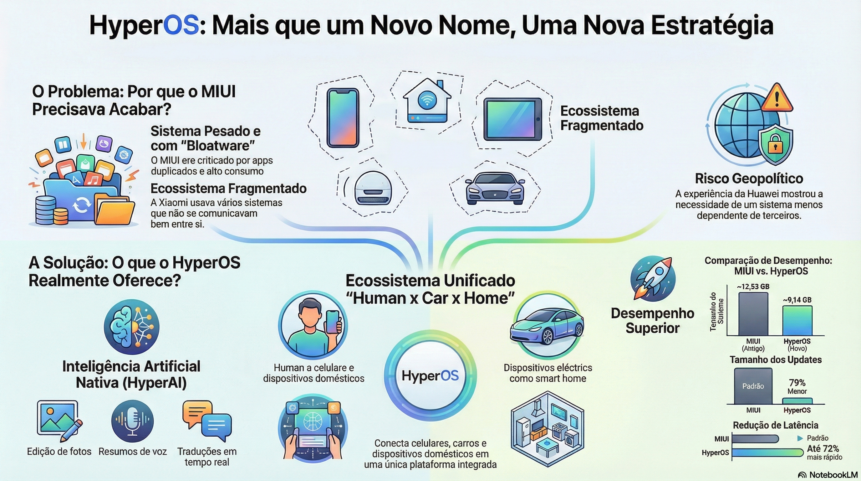 O HyperOS não é apenas MIUI com novo nome. É a reformulação completa da estratégia de software da Xiaomi, preparando a empresa para um futuro onde: