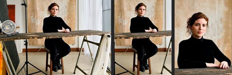 Minha única fonte de luz está travada no céu, impossível de ser mexida, para controlar a área iluminada do rosto e corpo, a única opção que resta é mexer a própria modelo, uso uma malandragem aqui, aprendida com os pintores: