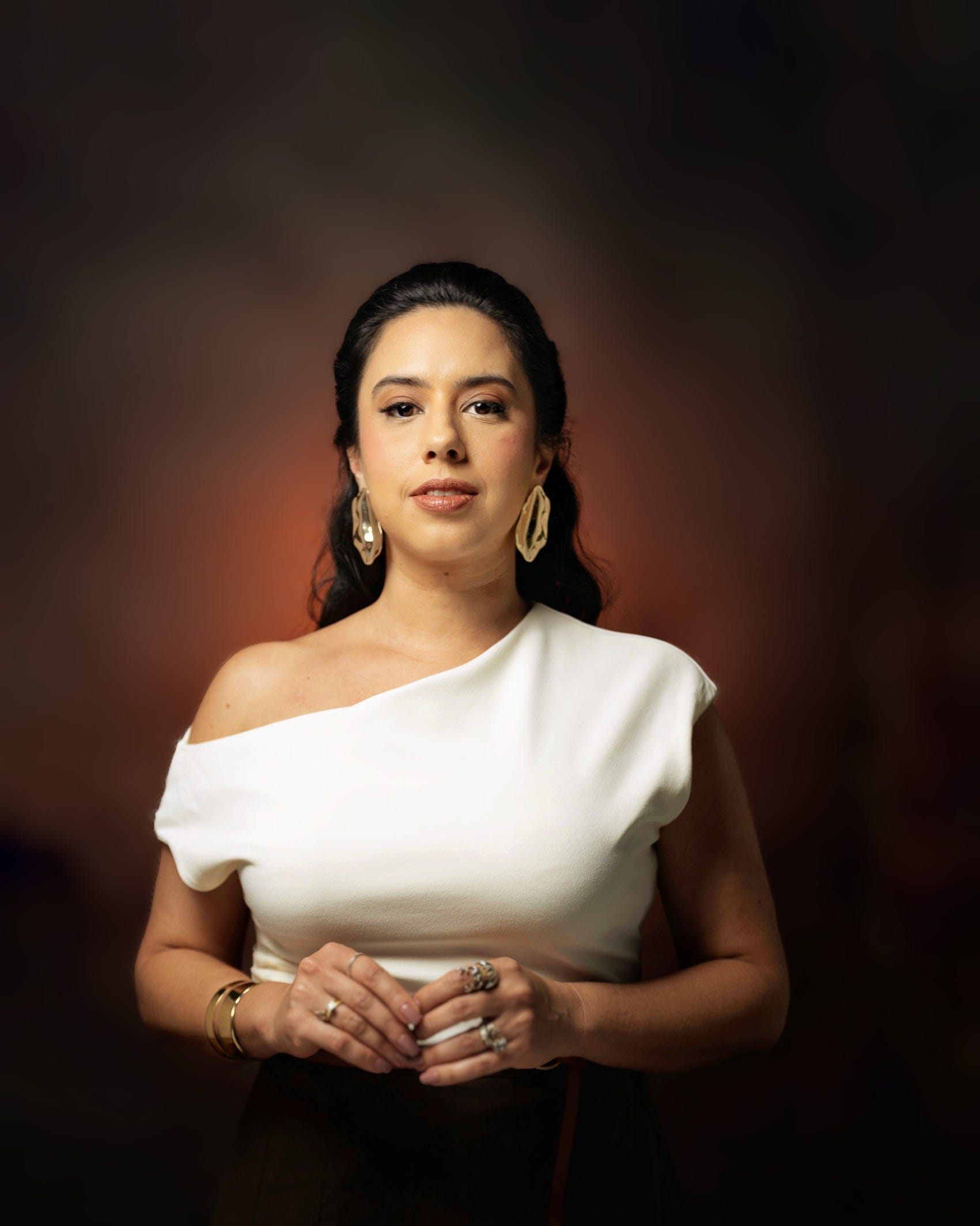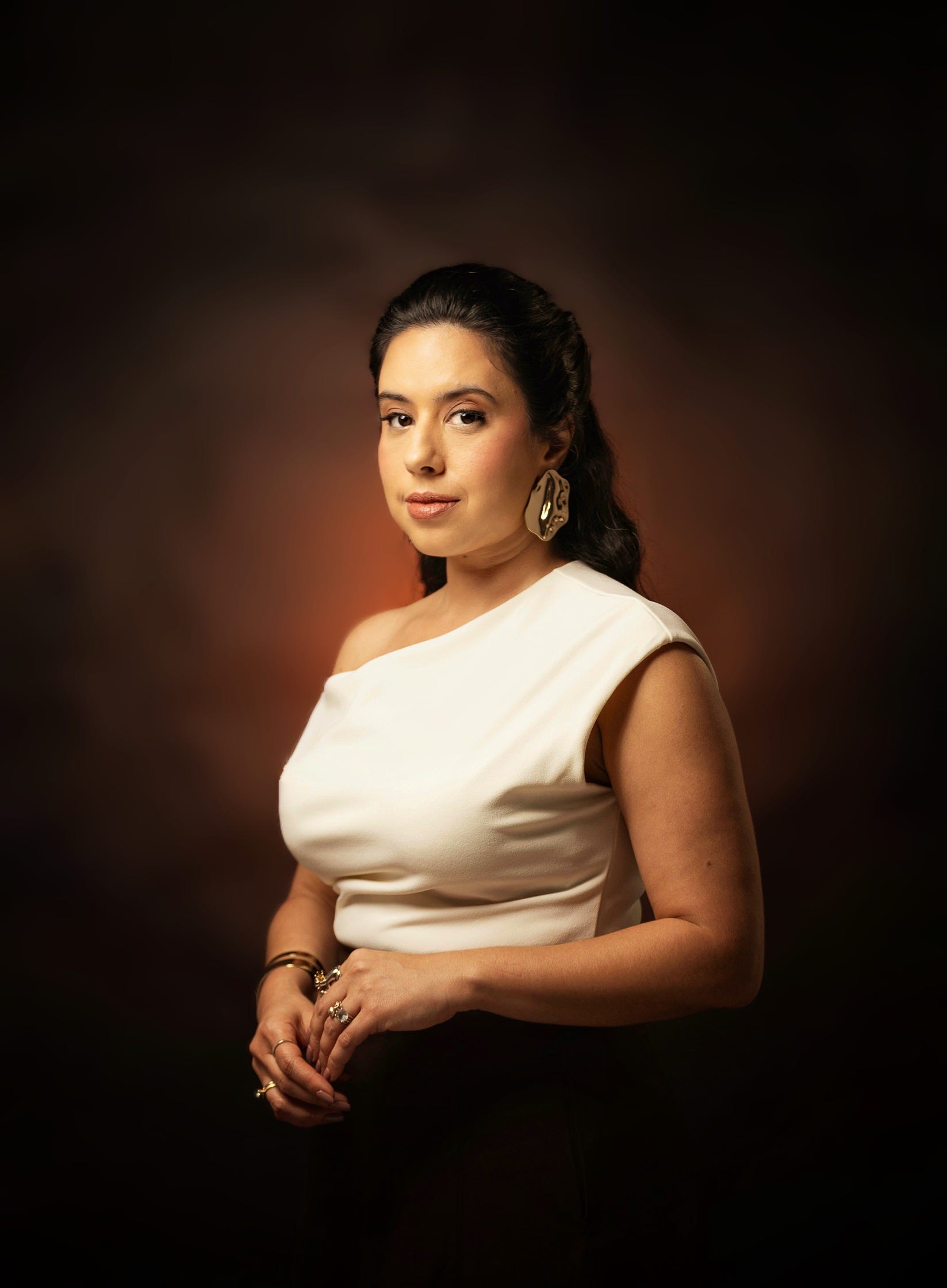 Fase 2 - Introdução de contraste (meio da sessão): Mantive a chinesa frontal, adicionei bastão de LED laranja no fundo (tons terra/terracota do manual) e um LED lateral para recorte sutil. A modelo já está confortável, posando naturalmente.