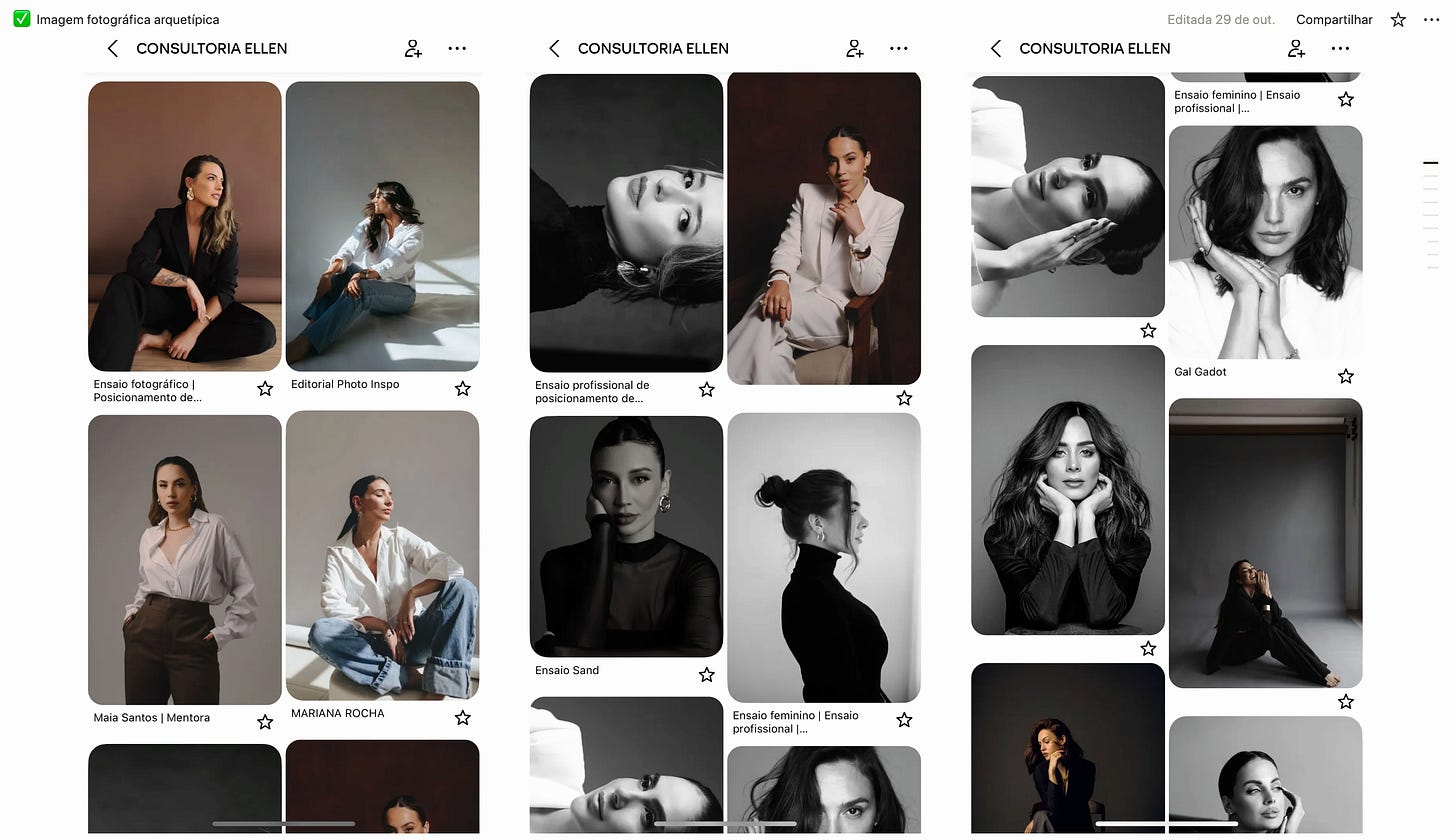 A primeira coisa que Ellen fez - e que 90% dos fotógrafos ignoram - foi criar um caderno de referências completo. Não estou falando de um Pinterest desorganizado com “fotos bonitas”. Era um documento estratégico definindo: